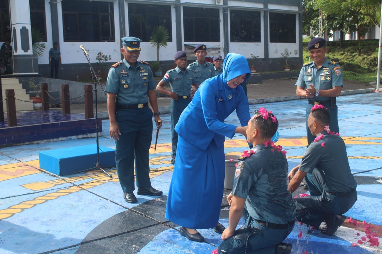 Dengan didampingi Ketua Cabang 3 Korcab IX Daerah Jalasenastri Armada III, Ny. Wenty Ardyan, melakukan penyiraman air kembang kepada personil yang naik pangkat dan turut disaksikan jajaran perwira staf serta anggota Bintara dan Tamtama.(MT-01)