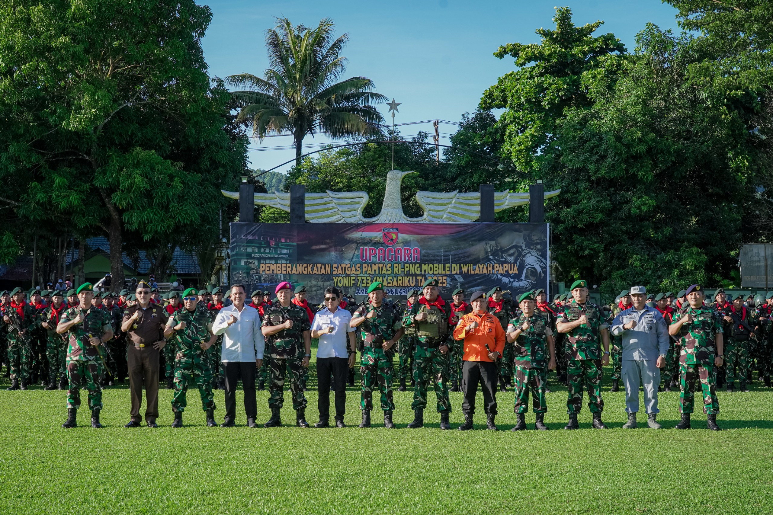 Ambon,moluccastimes.id-450 prajurit yang tergabung dalam Satgas Pamtas RI-PNG Mobile di wilayah Papua Yonif 733/Masariku TA 2025 dilepas Pangdam XV/Pattimura, Mayjen TNI Putranto Gatot Sri Handoyo, S.Sos., M.M., di Makoyonif 733/Masariku, Waiheru, Kamis 02/01/2025.