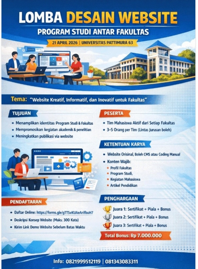 Ambon,moluccastimes.id-Dalam rangka mengidentifikasi program studi fakultas, serta mempromosikan kegiatan akademik dan penelitian bahkan meningkatkan publikasi via website, Dies Natalis ke-63 diwarnai juga dengan Lomba Desain Website Program Studi Antar Fakultas.