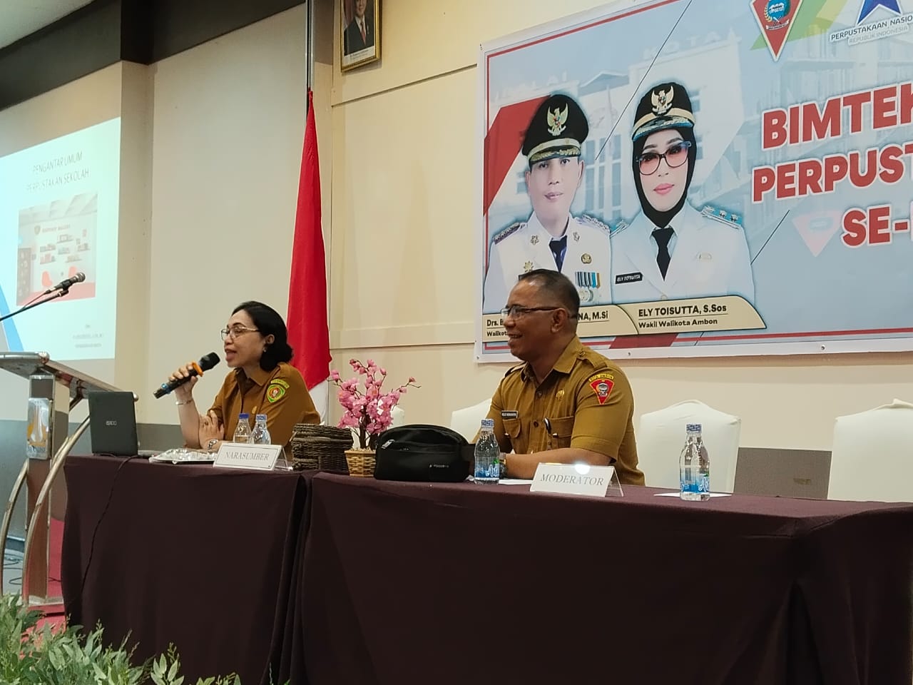 Pada hari pertama para pengelola perpustakaan sekolah menerima teori, yang dipandu Sekertarsi Dinas Perpustakaan dan Kearsipan Kota Ambon, C. Moniharapon, S.Pd, M.Pd.