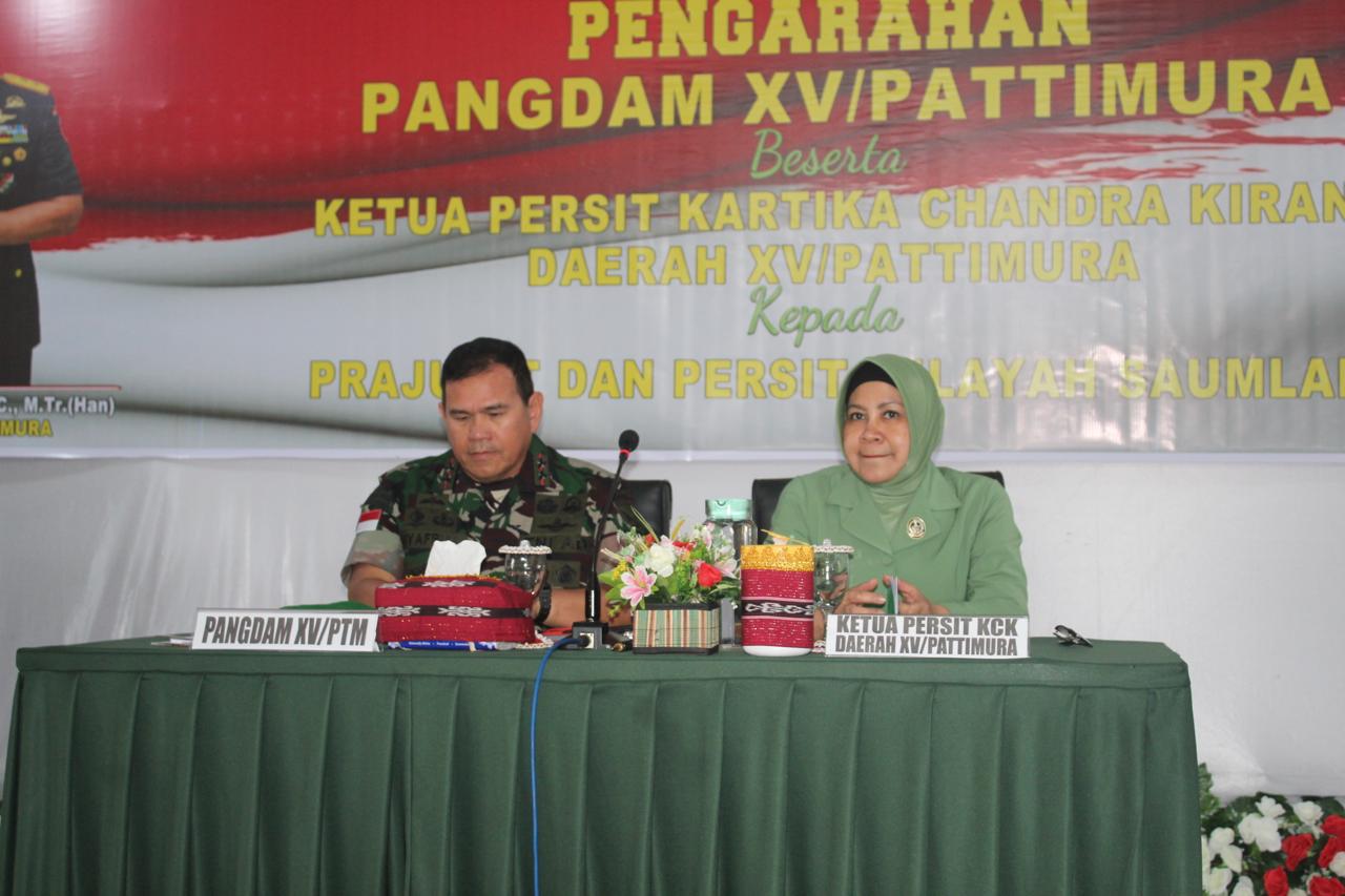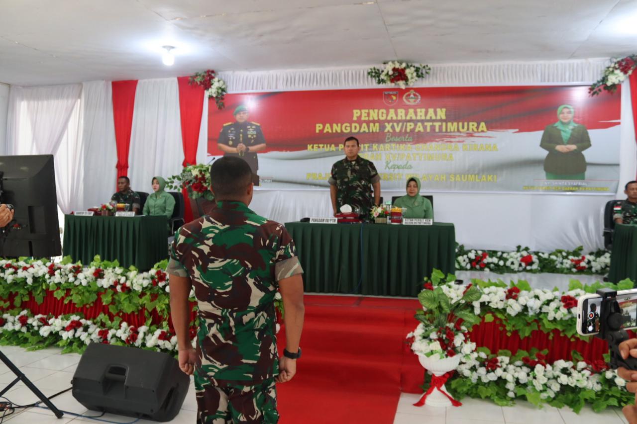 Selanjutnya, Pangdam memberikan pengarahan kepada prajurit Kodim 1507/Saumlaki beserta Persit Kodim 1507/Saumlaki, Prajurit Subdenpom Saumlaki beserta Persit dan Prajurit Yonif 734/SNS beserta Persit Yonif 734/SNS. Dalam pengarahannya, Pangdam menjelaskan bahwa, kunjungannya ini bertujuan untuk lebih mengenal dan memahami Satuan serta melihat secara langsung keadaan prajuritnya.