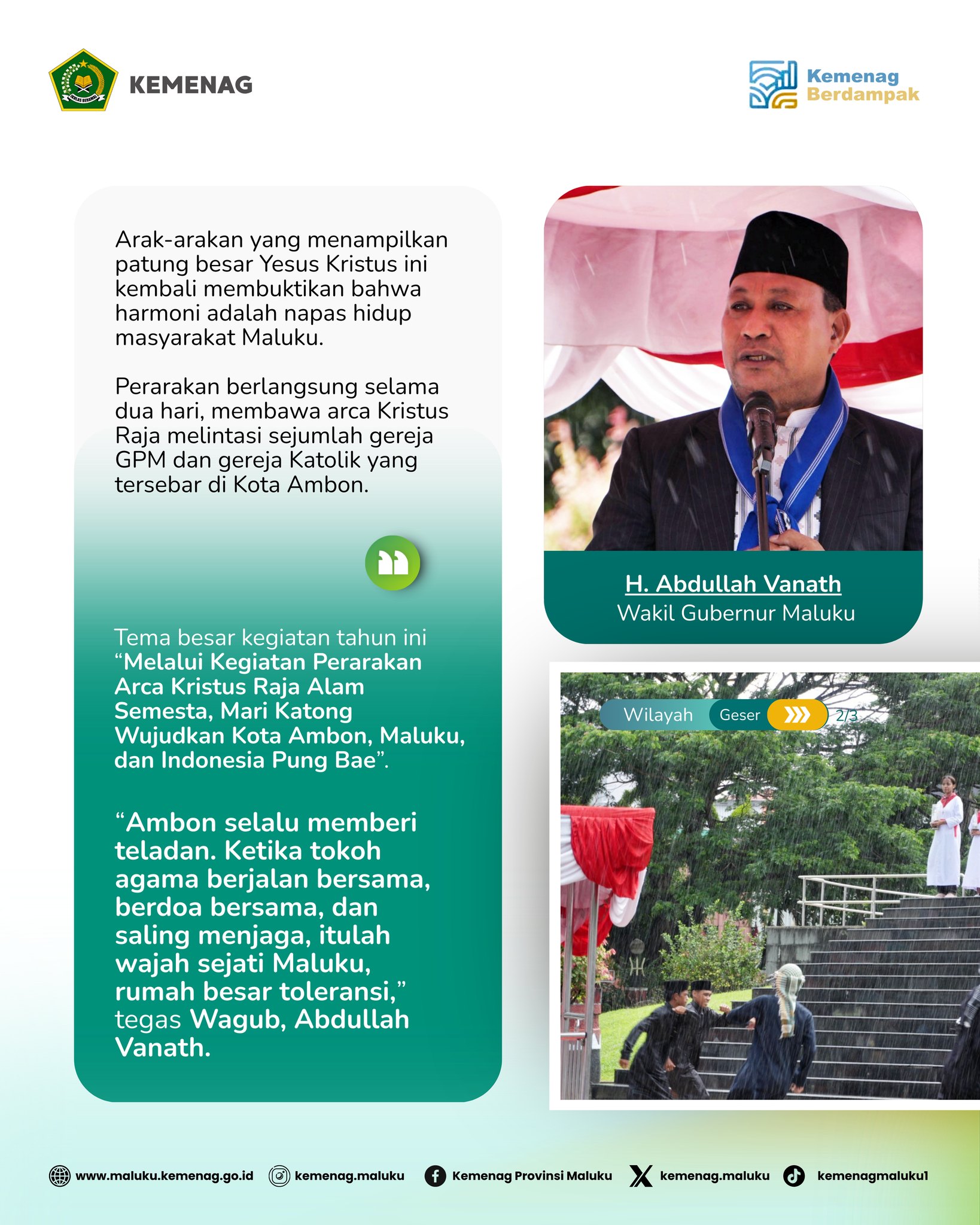 Demikian pernyataan Wakil Gubernur Maluku, H. Abdullah Vanath, S.Sos disela Doa Damai Lintas Agama dalam rangka Perarakan Arca Kristus Raja Alam Semesta di Gong Perdamaian, Sabtu 22/11/2025.