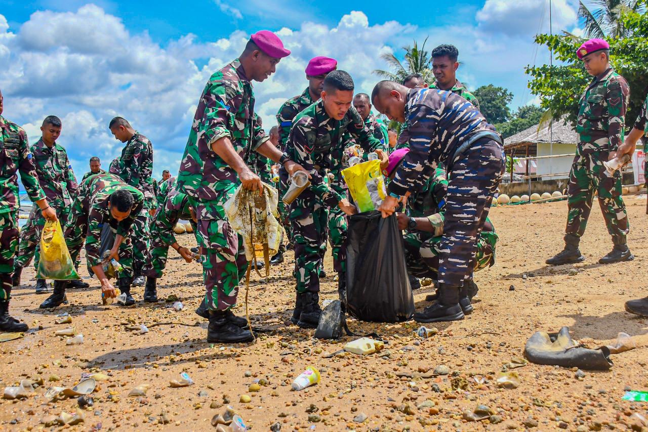 Dalam hal tersebut prajurit Yonmarhanlan IX menyisir garis pantai untuk mengumpulkan sampah plastik dan limbah rumah tangga yang terbawa arus.