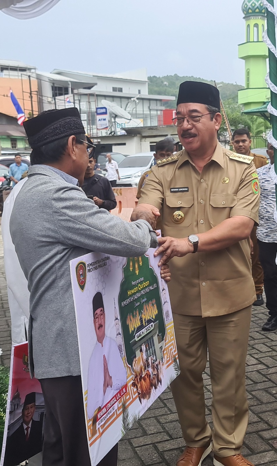 Hewan Qurban tersebut diserahkan secara simbolis oleh Gubernur Maluku Hendrik Lewerissa kepada Imam Masjid Al-Fatah, Perwakilan Yayasan Al-Fatah, dan Pengurus Masjid Jami Kota Ambon