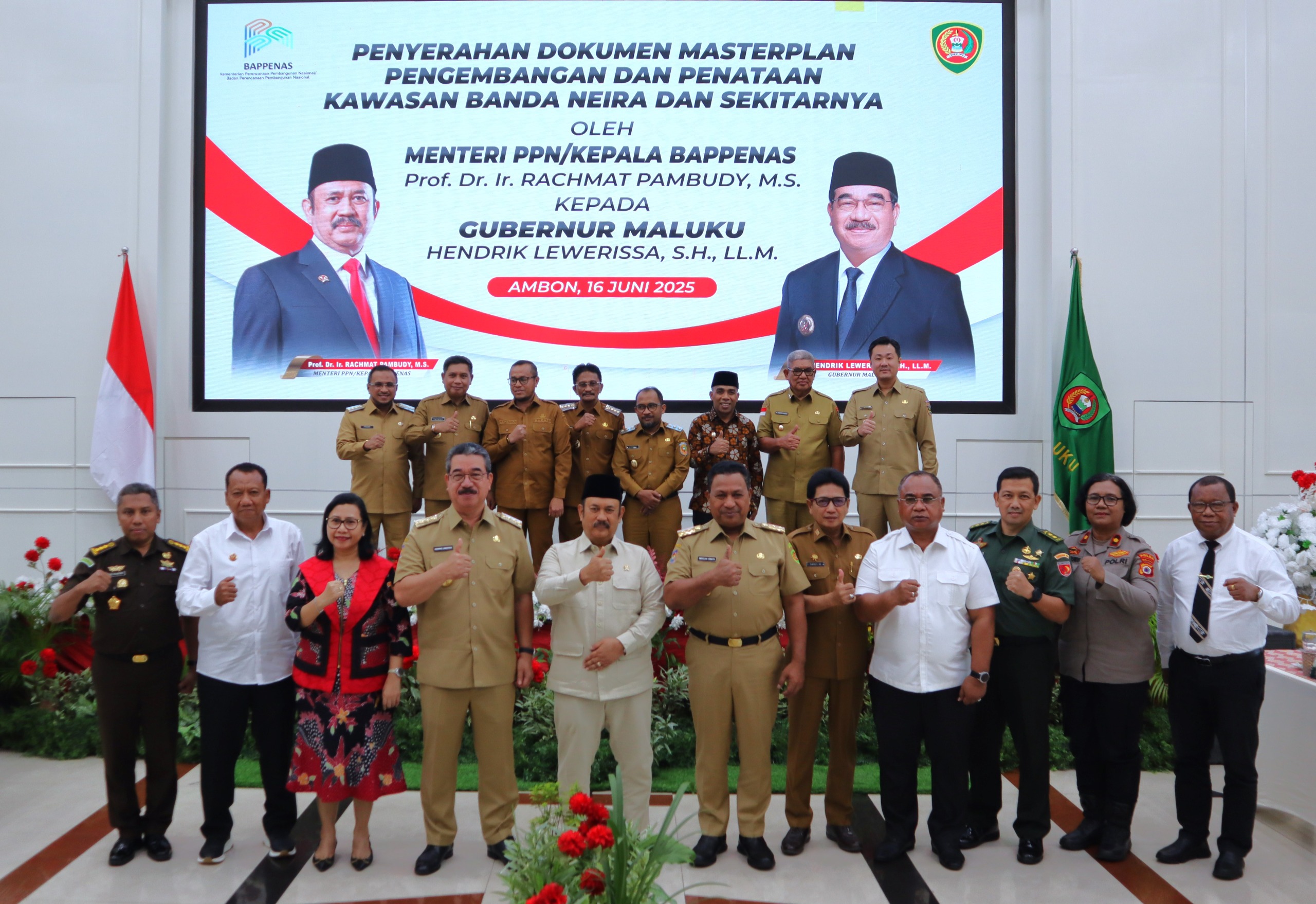 Ambon,moluccastimes.id-Dalam Kunjungan Kerjanya di Provinsi Maluku, Menteri Perencanaan Pembangunan Nasional/Kepala Badan Perencanaan Pembangunan Nasional, Rachmat Pambudy menyerahkan Dokumen Rencana Induk (Masterplan) Pengembangan dan Penataan Kawasan Banda Neira dan sekitarnya untuk tahun 2025-2045 di Aula Lantai 7 Kantor Gubernur Maluku, Senin 16/06/2025.
