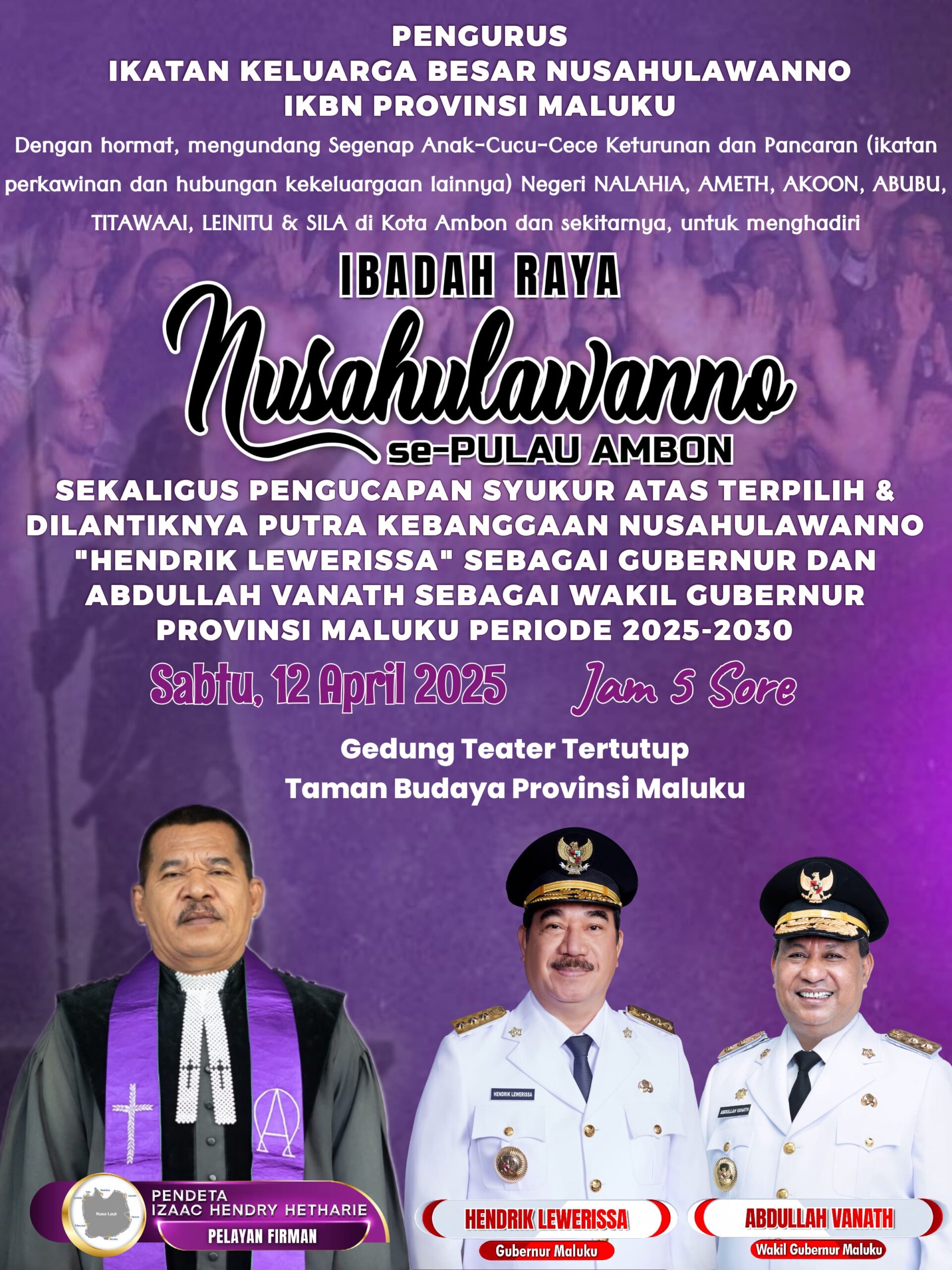 Ambon,moluccastimes.id-Mensyukuri Anak Pulau Putra Nusahulawanno, Hendrik Lewerissa sebagai Gubernur Maluku, Ikatan Keluarga Besar Nusahulawanno (IKBN) Provinsi Maluku menggelar acara syukuran di Gedung Teater Tertutup Taman Budaya Provinsi Maluku, Sabtu 12/04/2025.