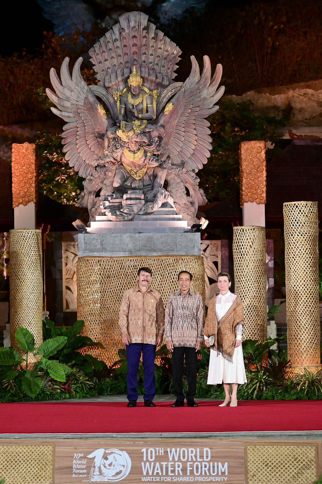 Dengan mengenakan kemeja kain tenun sintang, Presiden Jokowi tiba di GWK, sekitar pukul 18.50 WITA. Secara berurutan, Jokowi menyambut Presiden World Water Council, Loic Fauchon, Wakil Perdana Menteri (PM) Papua Nugini John Rosso, Utusan Khusus Belanda Meike van Ginneken, Presiden Majelis Umum PBB Dennis Francis, Utusan Khusus Prancis Barbara Pompili, dan Utusan Khusus Persatuan Emirat Arab Suhail Mohamed Al Mazroui. Juga Wakil PM Malaysia Dato Sri Haji Fadillah Bin Haji Yusof, Utusan Khusus yang juga Presiden Hungaria 2012-2022 János Áder, PM Tajikistan Qohir Rasulzoda, Presiden Sri Lanka Ranil Wickremesinghe, Presiden Fiji Ratu Wiliame Maivalili Katonivere, dan Ketua DPR RI Puan Maharani yang juga Perwakilan Presiden International Parliamentary Union (IPU).(MT-01)