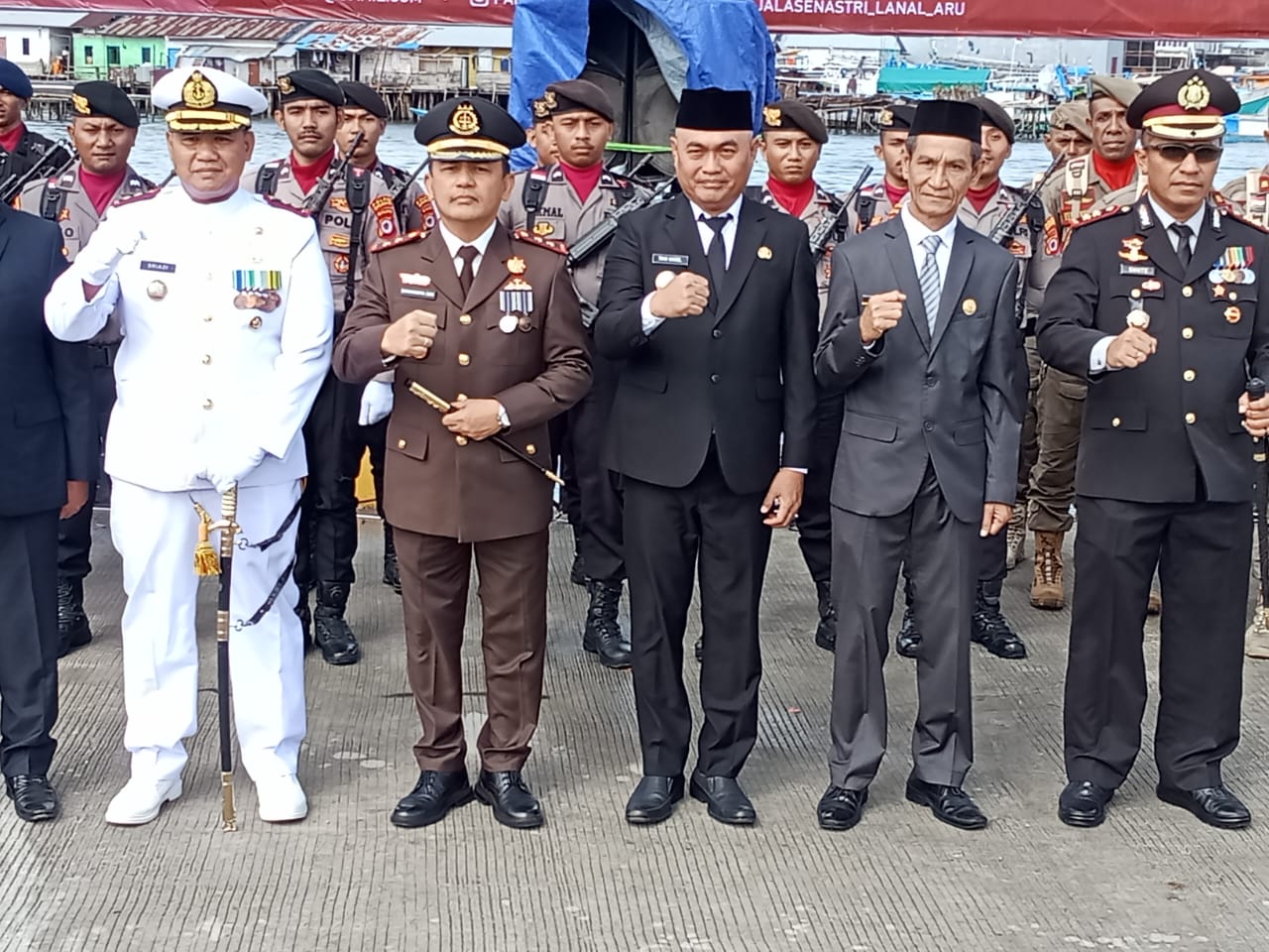 Bertindak selaku Inspektur Upacara, Bupati Kepulauan Aru, Timotius Kaidel dengan Komandan Upacara, Paur Intel Posal Benjina Lanal Aru, Letda (Mar) Rusdy Rustam. Sementara Perwira Upacara dari Dan Unit Intel Lanal Aru, Letda Laut (E) Randi Wahyu Permana.