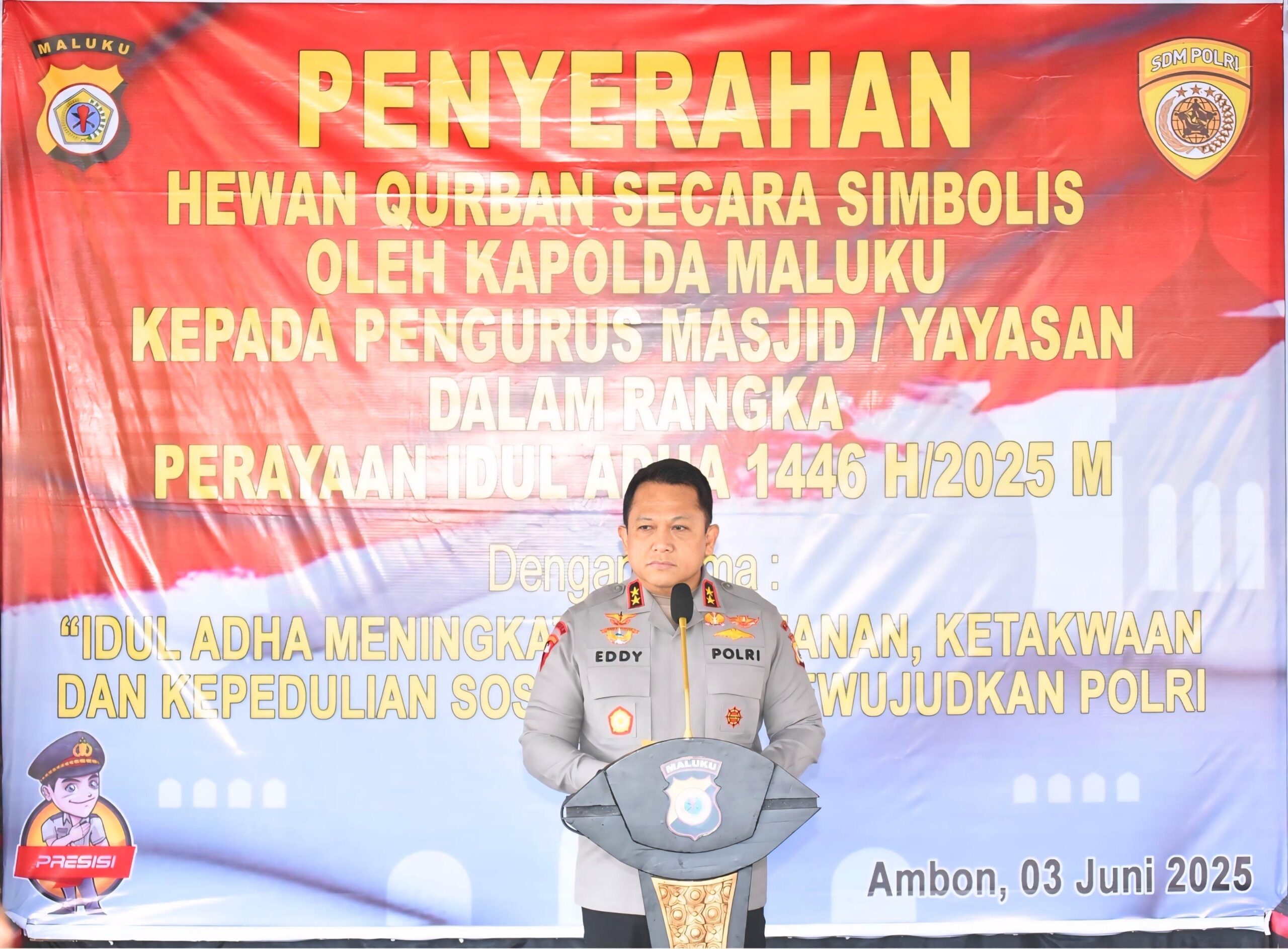 “Kami berharap setelah penyembelihan, daging hewan qurban dapat disalurkan langsung kepada para kaum duafa atau orang-orang yang berhak menerima yang ada di lingkungannya masing-masing,” harap Kapolda Maluku, Irjen Pol. Drs. Eddy Sumitro Tambunan, M.Si.