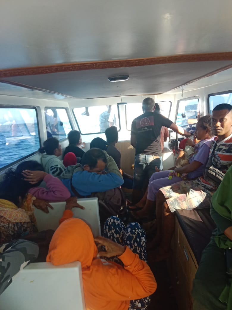 MalukuBaratDaya,moluccastimes.id-Terpanggil memberikan bantuan kemanusiaan, Kepolisian Sektor Mdona Hyera bersama Syahbandar Mahaleta dan Pemerintah Desa dan Kecamatan Mahaleta melakukan evakuasi penumpang Kapal KM. Lintas Bahari Indonesia yang hanyut terbawa arus di Laut Pulau Sermatang, Minggu malam 09/06/2024.