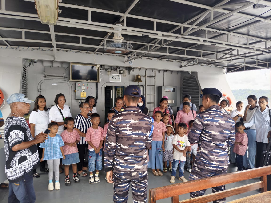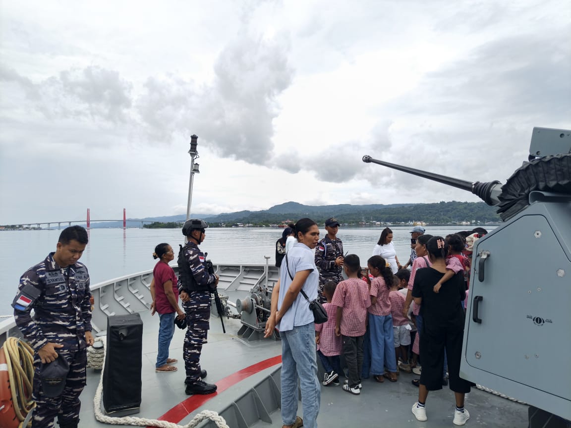 Dua orang Bintara Pembina Potensi Maritim dari jajaran Dinas Teritorial Kodaeral lX, yakni Serda Syamsi dan Serda Daffa bersama anggota KRI Posepa – 870 dengan ramah memandu jalannya kunjungan para murid di KRl.