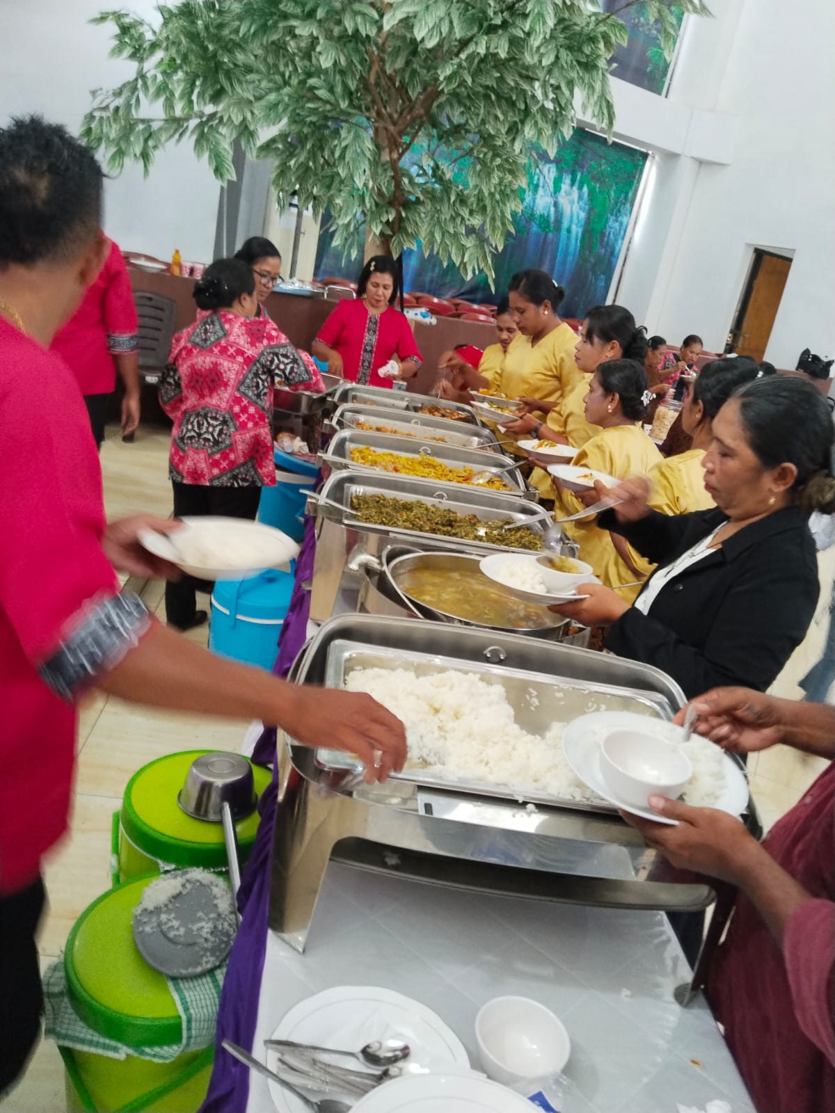 “Jadi per harinya, 6 jemaat yang melayani peserta untuk konsumsi. 1 jemaat terdiri dari 10 orang laki-laki dan perempuan. Setiap hari yang disediakan adalah sarapan pagi berupa kue dan teh atau kopi, kemudian makan siang, sorenya dijamu dengan snack serta teh dan juga kopi selanjutnya makan malam,” rincinya.