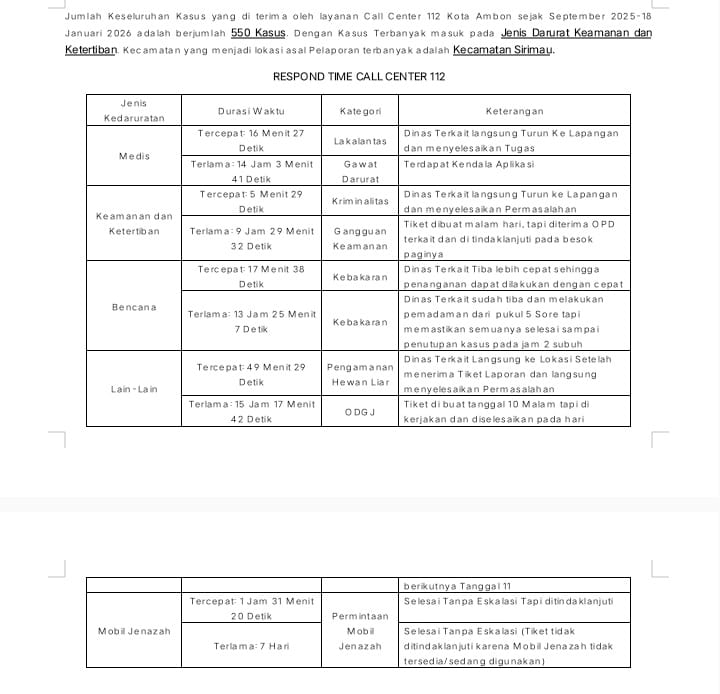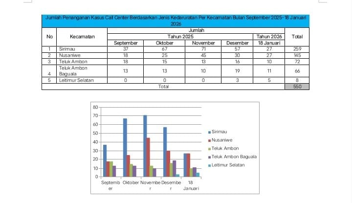Dari 5 Kecamatan, jumlah penanganan kasus CC 112 terbanyak adalah Kecamatan Sirimau sejak September 2025 hingga 18 Januari 2026 sebanyak 259 laporan, disusul Kecamatan Nusaniwe 145 laporan, Kecamatan Teluk Ambon 72 laporan, Kecamatan Baguala 66 laporan, Kecamatan Leitimur Selatan 8 laporan.