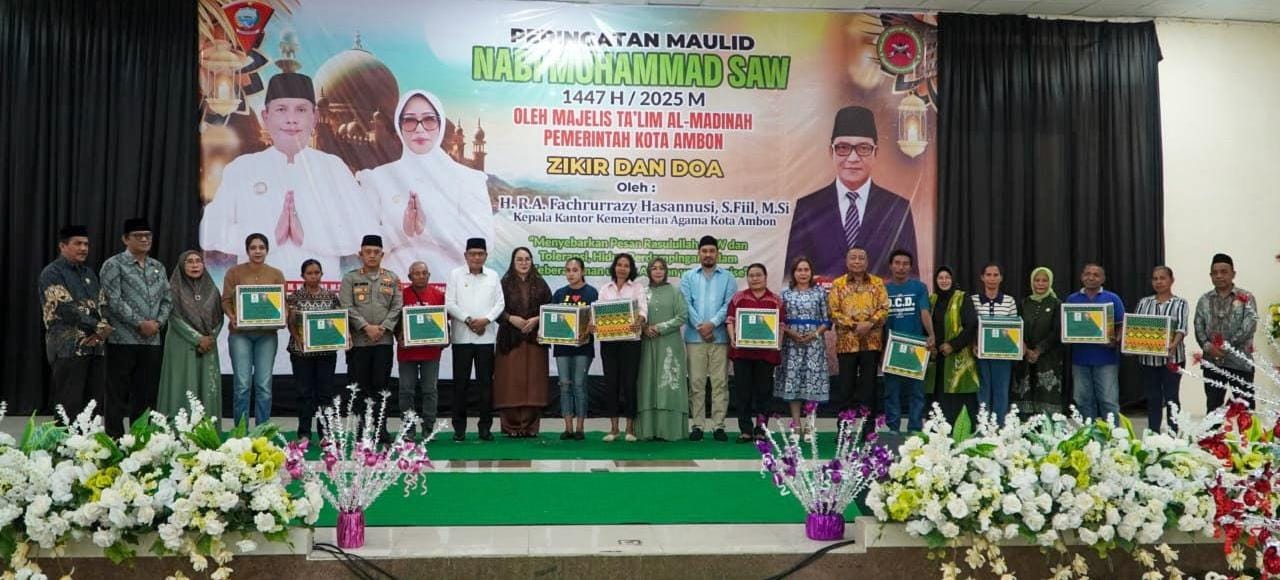 Maulid Nabi SAW yang digelar oleh Majelis Ta’lim Al-Madinah Pemkot Ambon itu dihiasi dengan lantunan zikir dan doa bersama dibawah pimpinan Kepala Kantor Kementerian Agama Kota Ambon, H. R. A. Fachrurrazy Hasannusi, F.Fil, M.Si.