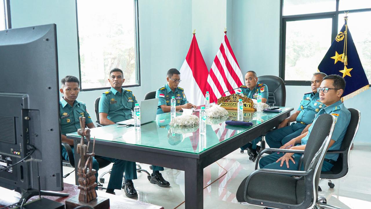 Tampak hadir dalam Vicon yang digelar di di Ruang Kerja Komandan Kodaeral IX, Halong, Kota Ambon, Maluku ini antara lain Wadan Kodaeral lX, Laksma TNl Dr. Muhammad Risahdi, Sahli D Jemen, Kolonel Laut (KH) Slamet Basuki dan tim.(MT-01)