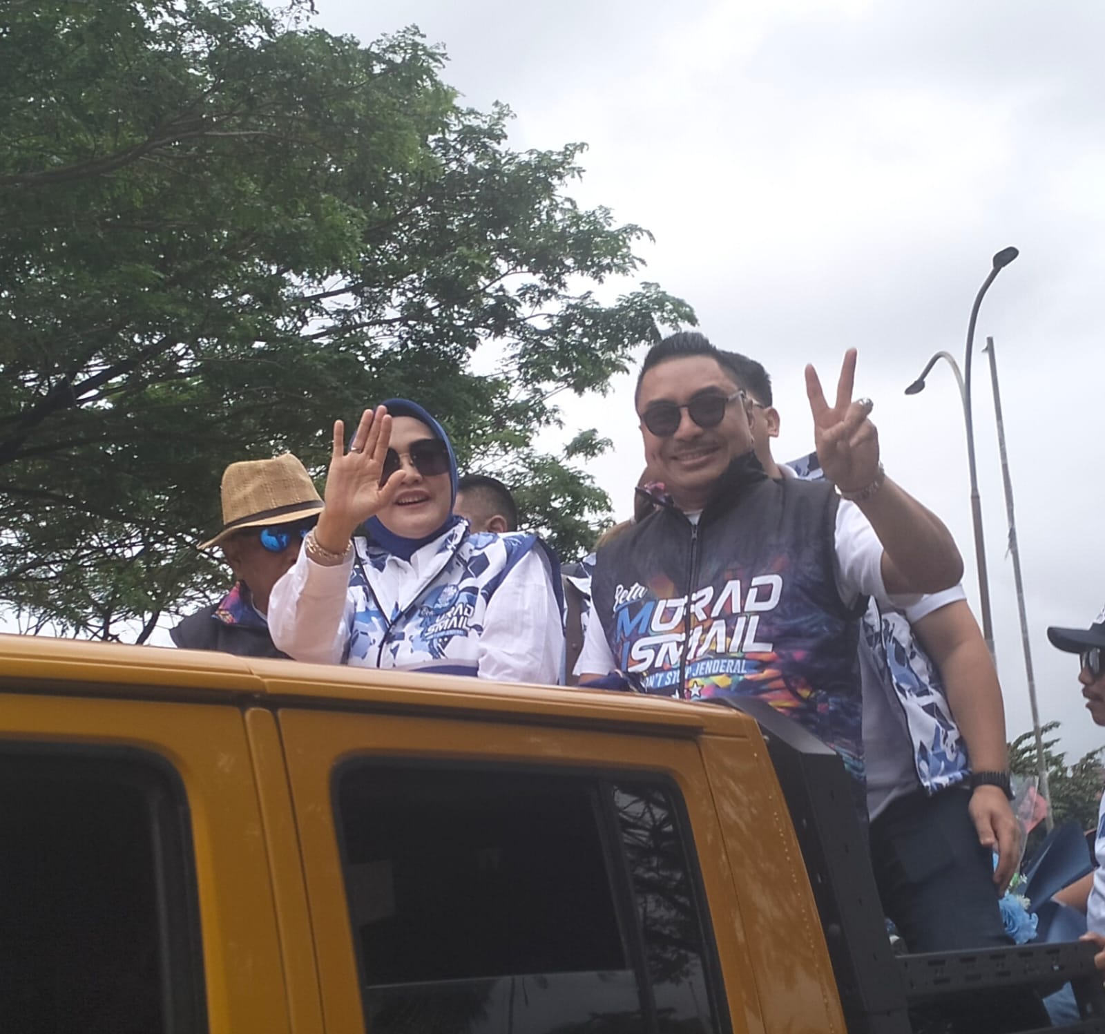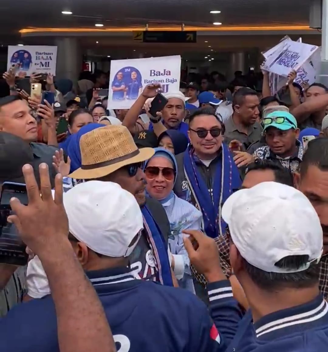 Tampak dalam penjemputan, istri MI, Widya Pratiwi Murad berhijab warna biru serta mengenakan kemeja putih bernuansa biru bertuliskan Baja Barisan Baja for Murad Ismail. Wanita cantik berkacamata hitam itu terus melambaikan tangan kepada masyarakat sepanjang jalan.