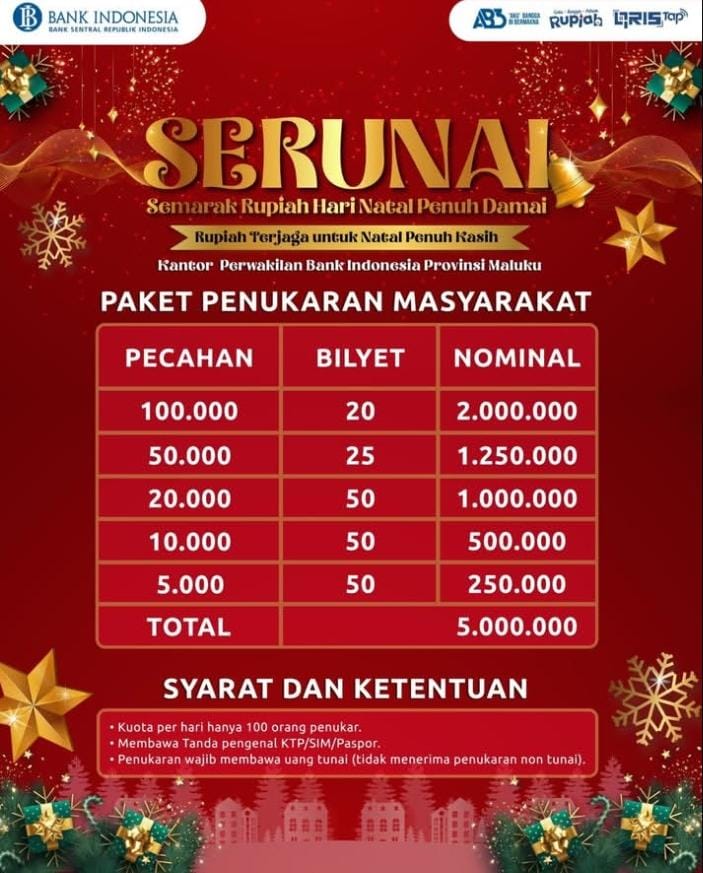 “Selain pelaksanaan penukaran kepada masyarakat, Bank Indonesia juga melakukan Edukasi Cinta bangga Paham Rupiah yang dirancang untuk meningkatkan pemahaman masyarakat mengenai keaslian Rupiah, cara merawat uang, serta penggunaan Rupiah secara bijak dalam kegiatan sehari-hari maupun pada momen perayaan Natal. Edukasi ini menyasar anak-anak, remaja hingga orang dewasa dengan pendekatan yang ringan, interaktif dan sesuai dengan suasana perayaan,” tandasnya.