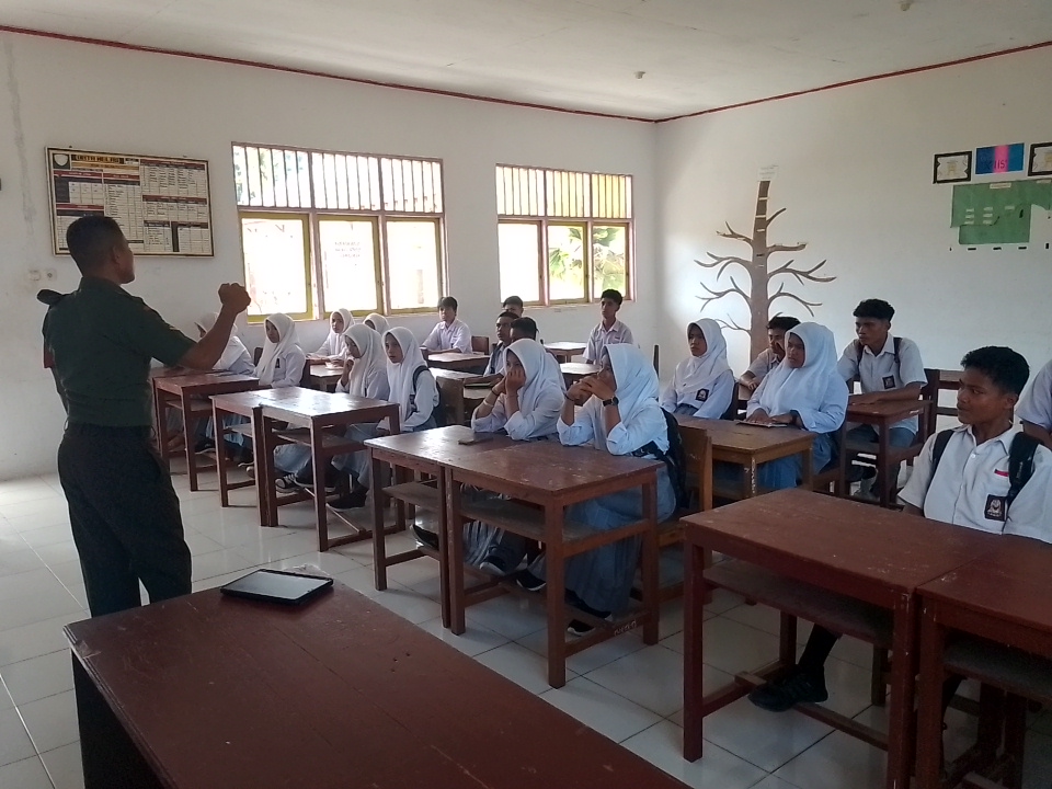 Tulehu,moluccastimes.id-Berperan sebagai motivator dan teladan bagi generasi muda Maluku, Babinsa Koramil 1504-04/Salahutu, mengeduksi siswa-siswi SMA Negeri 22 Maluku Tengah tentang 4 pilar kebangsaan, Rabu 07/05/2025.
