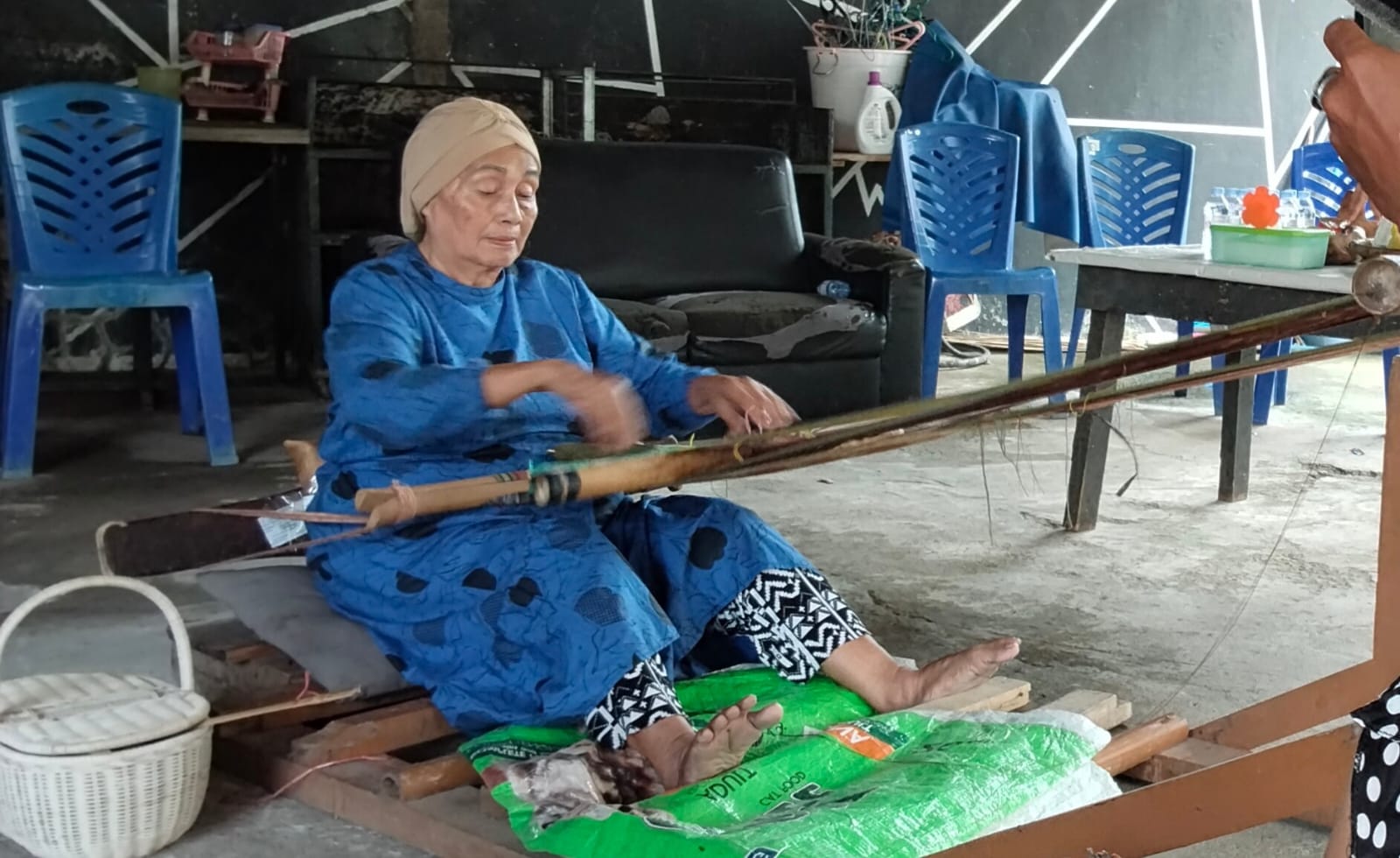 “Untuk mendapatkan warna benang kita menggunakan bumbu dapur seperti cabai dan rempah alami yang kemudian difermentasi, memakan waktu 10 hingga 15 hari untuk menghasilkan warna yang kuat dan tahan lama. Untuk mendapatkan satu warna saja, prosesnya bisa diulang tiga kali. Dari situ baru masuk ke tahap pengikatan motif dan penenunan,” jelasnya.