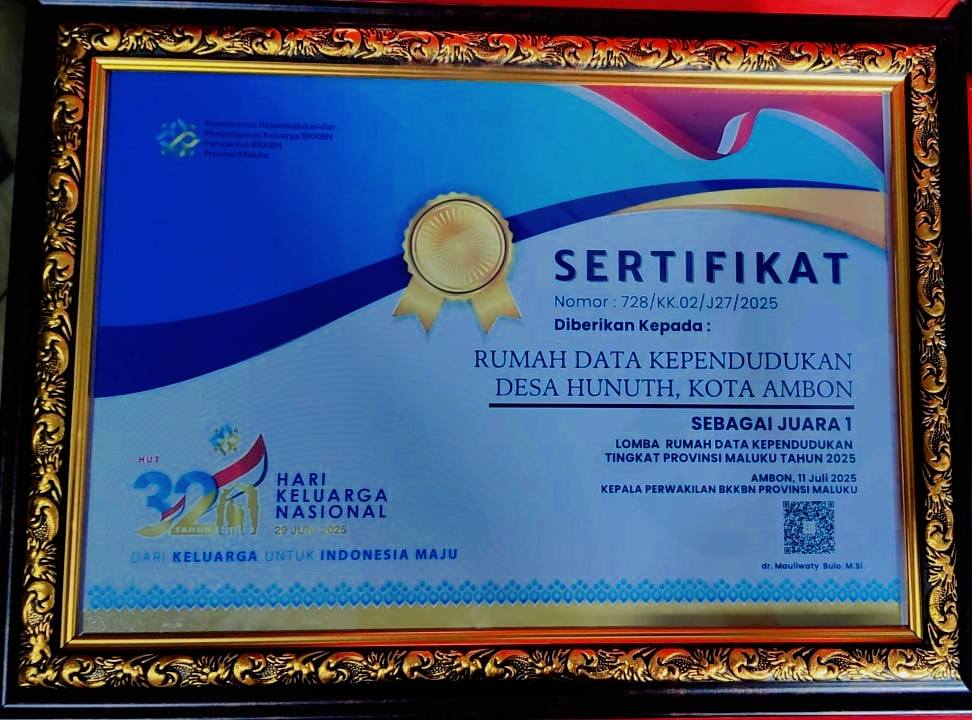 Juara 1 Terbaik Pengelola Program Pembangunan Keluarga, Kependudukan dan KB (Bangga Kencana) Tingkat Provinsi Maluku.