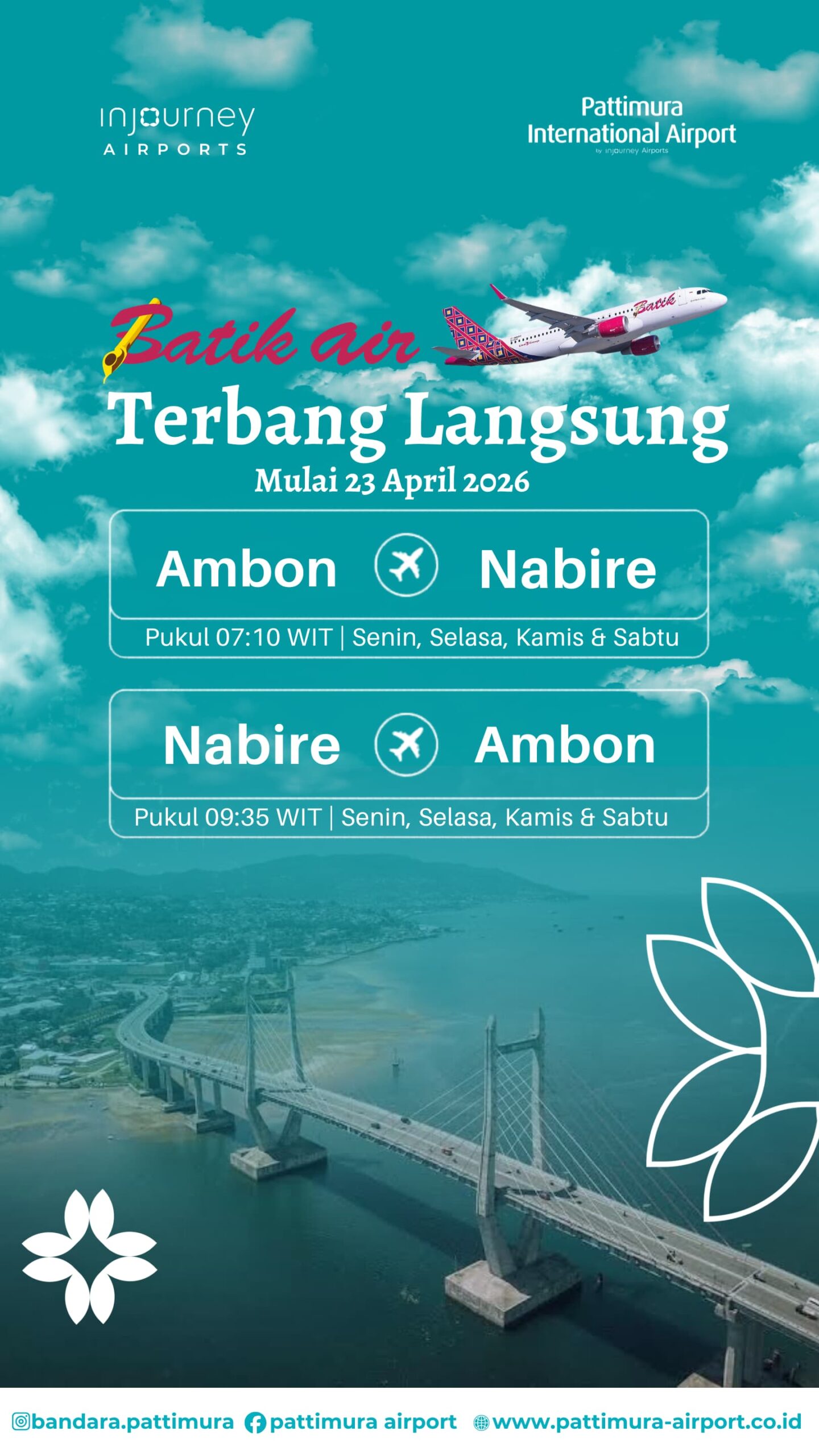 “Selain efisiensi waktu, maskapai Batik Air memberikan nilai tambah berupa fasilitas bagasi cuma-cuma (Free Baggage Allowance) sebesar 20kg bagi setiap penumpang. Kami di Bandara Pattimura terus berupaya memastikan kesiapan fasilitas infrastruktur dan layanan prima guna mendukung kelancaran operasional rute baru ini,” ucap pria smart itu.