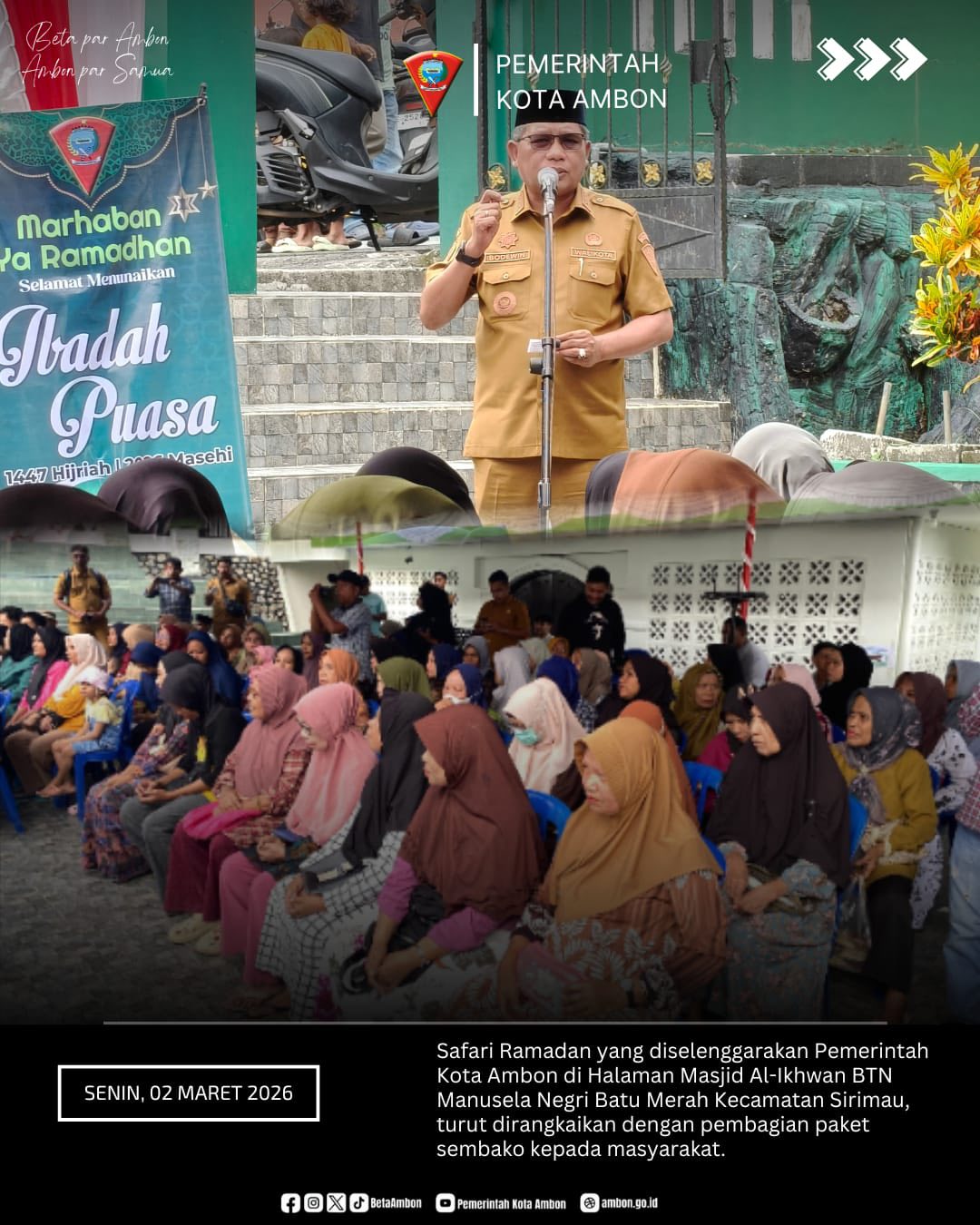 Ambon,moluccastimes.id-Titik ke-tiga safari Ramadhan 1447 Hijriah yang digelar Pemerintah Kota Ambon berlokasi di Masjid Al-Ikhwan, RW 21 BTN Manusela, Negeri Batu Merah, Senin 02/03/2026.
