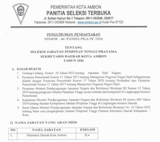 Ambon,moluccastimes,id-Pemerintah Kota Ambon membuka seleksi kompetensi jabatan Pimpinan Tinggi Pratama Sekertaris Daerah Kota Ambon 2026.