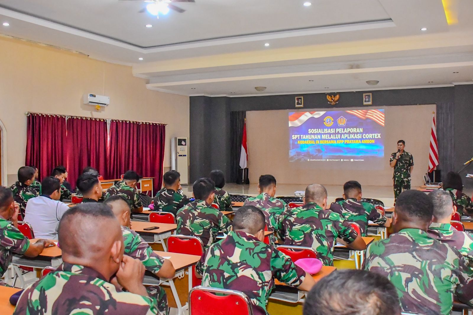 Kegiatan sosialisasi tersebut dihadiri Aslog Kodaeral IX, Pgs Asrena Kodaeral IX, Kadis Komlek Kodaeral IX, Kaakun Kodaeral IX dan perwira staf Kodaeral lX lainnya sebagai bentuk komitmen memastikan setiap personel TNI Angkatan Kodaeral lX tertib pajak dan transparan.