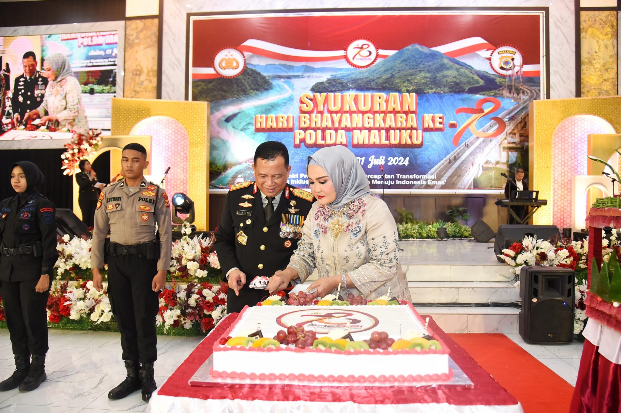 Syukuran peringatan HUT Bhayangkara ke-78 di Polresta Ambon dihadiri Forkopimda kota Ambon, ketua DPRD kota Ambon, Ely Toisuta, Dandim 1504/Ambon, Kolonel Inf Leo Oktavianus M. Sinaga, Latupati kota Ambon, Ketua KPU kota Ambon, ketua MUI kota Ambon, Tokoh Agama, Masyarakat, pemuda, Mitra perbankan, dunia usaha perhotelan, Mitra Kamtibmas.(MT-01)