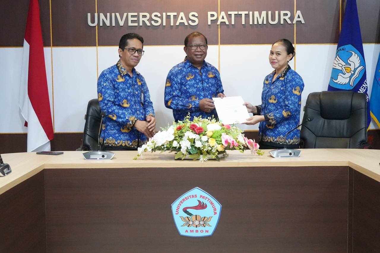 Penyerahan SK dilakukan oleh Plt. LLDikti Wilayah XII Maluku, Prof. Dr. Saiful Deni, M.Si yang berlangsung di ruang kerja Rektor Unpatti, Kamis 26/02/2026.