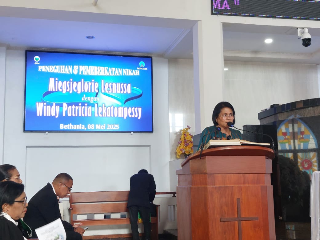 Ambon,moluccastimes.id-Mewakili Ketua TP PKK Kota Ambon, Felicia Wattimena yang sedang melakukan tugas luar daerah, Kepala Dinas PPKB Kota Ambon, Ir. J.W Patty, M.Si memberikan Elektronik Siap Nikah dan Siap Hamil (Elsimil) kepada calon pengantin (Cantin) yang diberkati di Gereja Bethania Ambon, Kamis 08/05/2025.