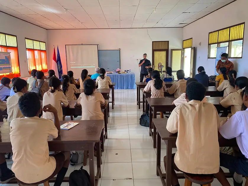 “Kami dipersilahkan bertemu dengan siswa kelas 9 untuk berbagi terkait sampah yang selalu berakhir di laut. Sampah tidak seharusnya dibuang ke air sungai yang berujung ke laut, tetapi harus dibuang pada tempat sampah dan tidak harus membakarnya apalagi sampah plastik. Mengapa? sebab, membakar sampah plastik di udara terbuka dan dekat dengan rumah bukan hal yang baik,” terangnya.